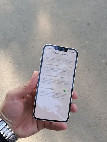 Şəkillərdə cihazın ön-yan-arxa görünüşü və “Batareya Sağlamlığı” bölməsi göstərilib. Dizaynı yastı kənarlı, kompakt və yüngüldür. iPhone 13 gündəlik istifadə, foto/video və oyunlar üçün güclü seçimdir.