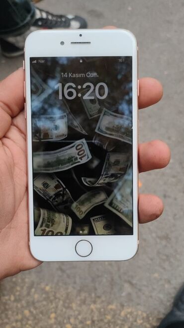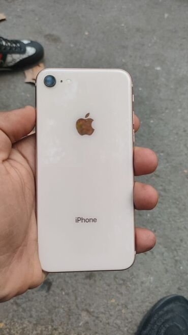 Apple iPhone (qızılı/Gold rəng) - Model: iPhone 8 seriyası (şəkillərə əsasən) - Korpus: Şüşə arxa, alüminium çərçivə, qızılı ton - Ekran: 4.7" Retina HD, ön paneldə Touch ID barmaq izi oxuyucusu - ...