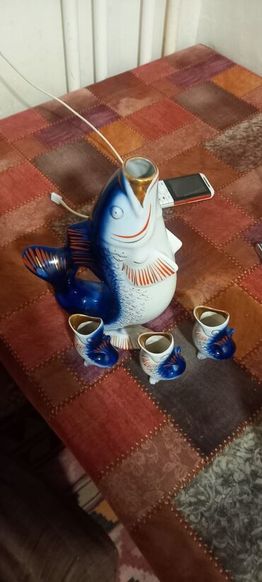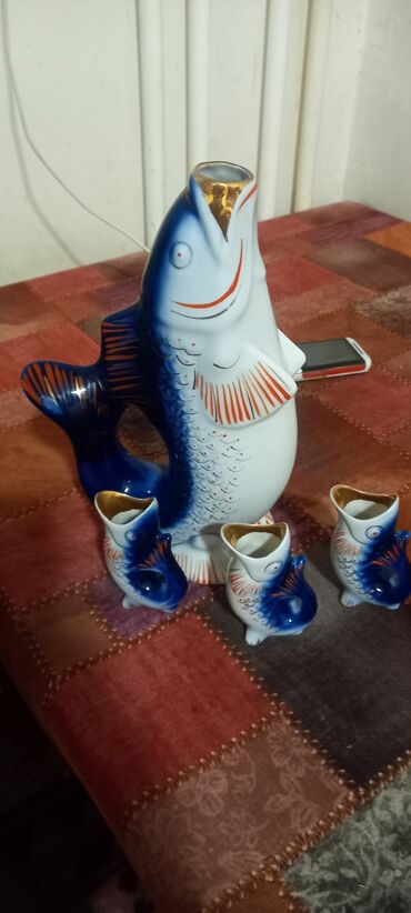 - Komplekt: 1 böyük qrafa/karaf (balıq formasında, yan tərəfdən qulp) + 3 kiçik stəkan (balıq formalı)