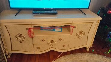 - TV stendi/komod: üst panel TV üçün genişdir; ortada açıq rəf, yanlarda qapalı bölmələr və alt çekmecələr. Qızılı gövdə bəzəkləri və düyməli tutacaqlar.