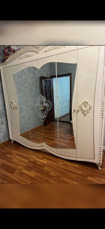 Müasir klassik üslubda yataq otağı dəsti Tərkibi: - 6 qapılı geniş qarderob: iki ədəd tam ölçülü güzgü qapı, içəridə asılqan bölmələri, rəflər və alt hissədə saxlama imkanları. Fasadda qızılı və n...