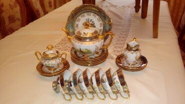 - Farfor çay/qəhvə dəsti: çaydan, qəndqabı, süd qabı, boşqablar və 6 fincan-nəlbəki (qızılı qulplu)