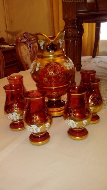 - 1 iri sürahi və 6 kiçik stəkan-bokaldan ibarət qırmızı-qızılı dəst