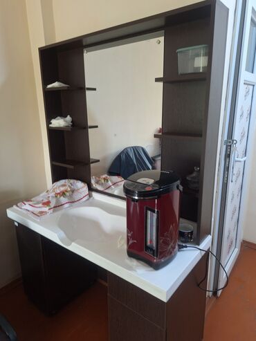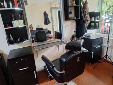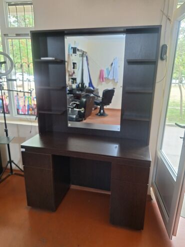 - Geniş iş masası və böyük divar güzgüsü olan bərbər postu: hər iki tərəfdə açıq rəflər, aşağı hissədə qapalı şkaf bölmələri və saxlama üçün çekmecələr.
