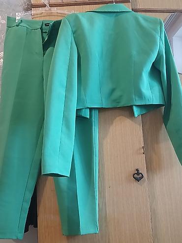 - Zümrüd-yaşıl rəngdə qadın kostyumu: qısa kəsimli pencək və eyni rəngli şalvar dəstidir.