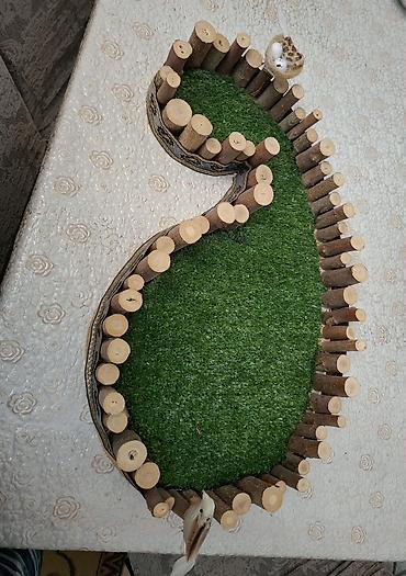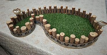 - Materiallar: kənarları müxtəlif hündürlüklü təbii ağac kəsikləri, iç hissə süni ot örtüyü; kənar boyunca naxışlı lent bəzəyi