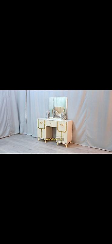 - Makiyaj masası: İki qapalı bölmə + bir üst çekmece; düzbucaqlı güzgü; dekorativ qızılı haşiyələr və tutacaqlar.