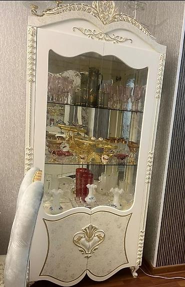- Vitrin şkafı – üst hissəsi şüşəli, 3 şüşə rəfli, arxa hissəsi güzgülü; alt bölmə qapalı saxlança; oyma və qızılı elementlərlə bəzədilmiş.