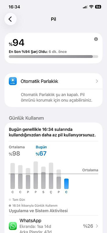 - Batareya: iOS batareya səhifəsi görüntüsündə 94% şarj göstəricisi; avtomatik parlaqlıq parametrləri açıq şəkildə göstərilib