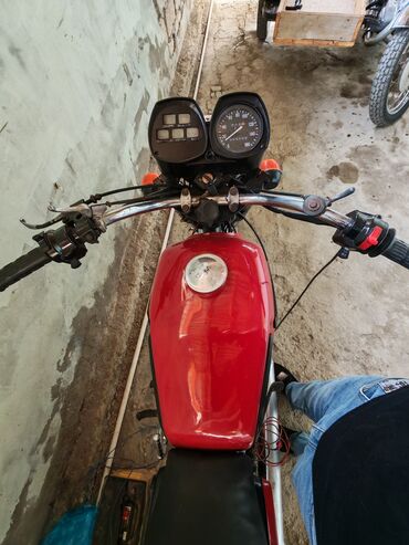 Məhsul: Kiçik həcmli yol motosikleti (qırmızı yanacaq çəni, qara oturacaq) Xüsusiyyətlər: - Tək silindrli benzin mühərriki, hava ilə soyudulan - Karbüratorlu yanacaq sistemi - Mexaniki sürətlər qu...