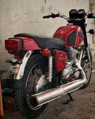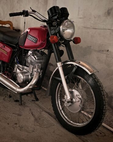 Klassik Sovet istehsalı motosiklet – IŽ (Jawa üslubuna bənzər retro yol motosikleti) Xüsusiyyətlər: - Ban növü: yol/klassik - Rəng: tünd-bordo gövdə, xrom detallarla - İki yerlik uzun oturacaq - İ...