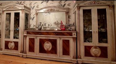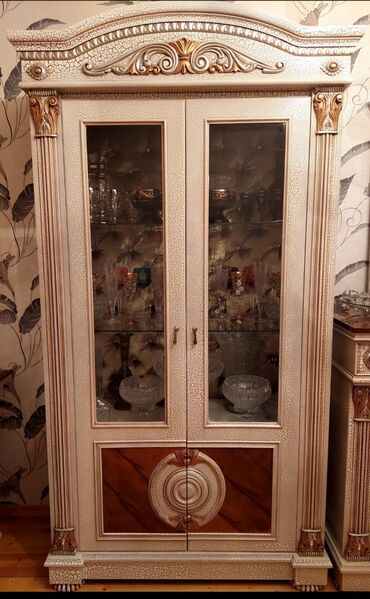 - 2 ədəd vitrin şkafı: ikiqat şüşə qapılı, şüşə rəflər, yuxarı hissədə oyma dekor, aşağı hissədə dekorativ panel.