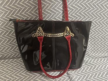 Qadın çantası – laklı parıltılı material, qara rəngdə gövdə və qırmızı rəngli tutacaqlar.