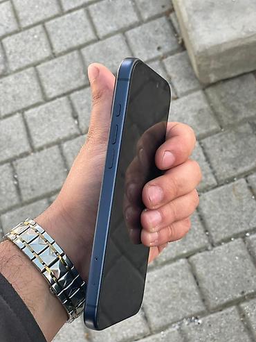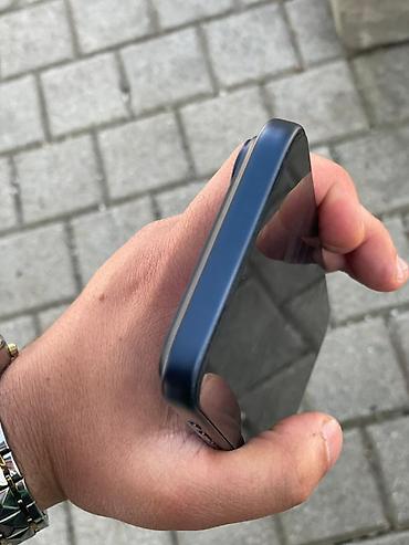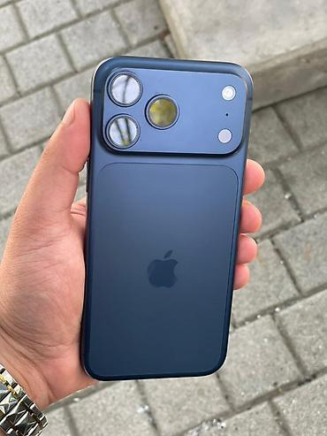 Apple iPhone (mavi rəng). 17 promax.Şəkillərdə göstərilən model Dynamic Island kəsiyi olan ekranla gəlir. Arxa hissədə iki böyük obyektivli kamera bloku və LED işıq mövcuddur. Ön tərəfdə Face ID üçün TrueDepth sistemi var.