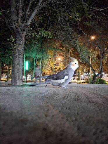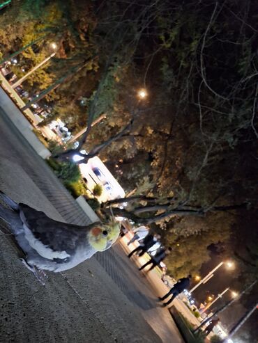 Nymph kakadu (cockatiel) – boz rəngli, yanaqlarında narıncı ləkələr, başında toqqa. Fotoşəkillərdə göstərildiyi kimi ağ-qumlu və qara-boz tonlarda lələklər, uzun quyruq, sarı zolaqlı alt quyruq his...