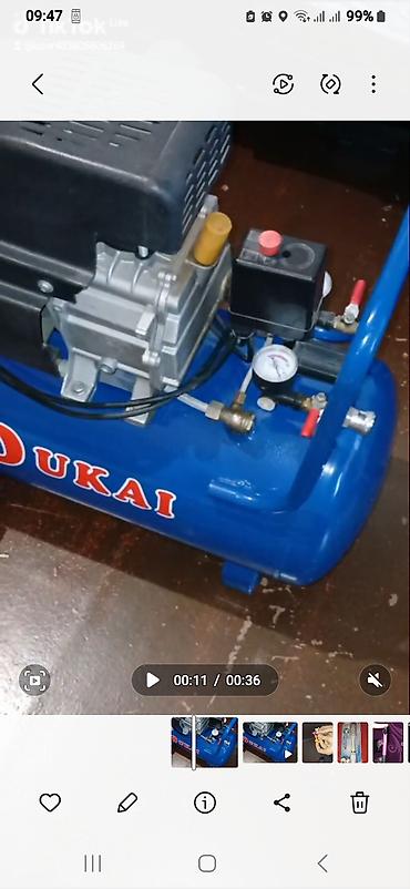 Oukai hava kompressoru - Brend: OUKAI - Tip: Elektriklə işləyən porşenli hava kompressoru - Qab (receiver) – mavi metal çən, manometrli - Təhlükəsizlik klapanı, tənzimləyici və sürətli çıxış rezen...