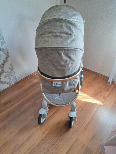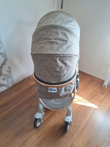 Uşaq arabası – Pouch brendi, 4 təkərli ön dönər sistemli şassi və geniş beşik/oturacaq bloku ilə.