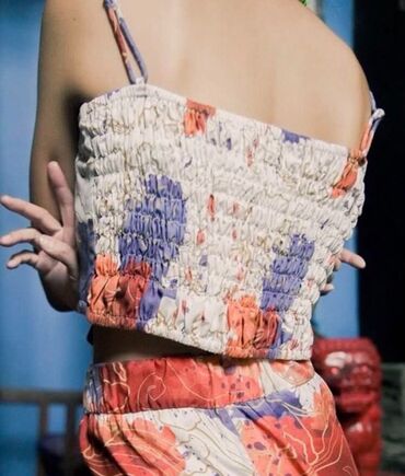 Güllü iki hissəli qadın dəsti: - Üst: çiyinləri açıq, elastik ətəkcikli qısa top. Nazik tənzimlənən qayışlar və rezinli büzgülər sayəsində bədənə rahat oturuş. Şəffaf, yüngül parça üzərində iri qız...