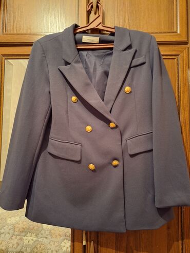 Qadın üçün klassik uzun blezer - Rəng: qara - Dizayn: ikiqat düyməli (double-breasted) - Düymələr: ön hissədə qızılı rəngli metal düymələr, manjetlərdə sıra düymələr - Yaxa: kənarları iti, klassik...