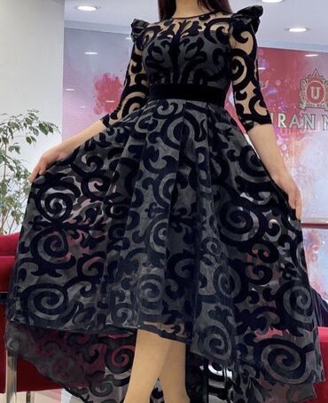 Alinib 350, satilir 250, təzə - Rəng: Dərin qara - Dizayn: V‑kəsimli sinə, bel hissəsində şəffaf tül üzərində gümüşü və qara muncuq/seqin bəzəkləri - Qollar: Həcmli, şifon, rezinli manjetlərlə - Et...