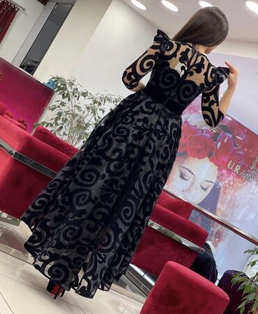 Sharuel Firma Qadın paltarı razmer (40) zərif məxmər və həcimli qol dizaynı - Model: uzun, bədənə oturan siluet, dizdən aşağı uzunluq - Material: əsas hissə qara məxmər; qollar parıltılı, toxumalı...
