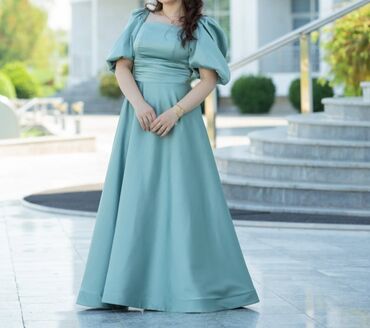 Zərif ziyafət libası – açıq adaçayı-yaşıl tonunda, uzun və axıcı ətəkli model. Ölçü 38 üçün uyğundur.