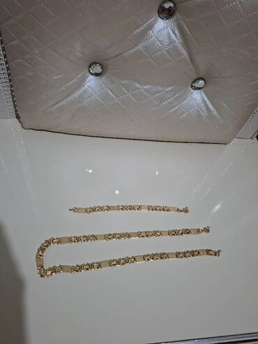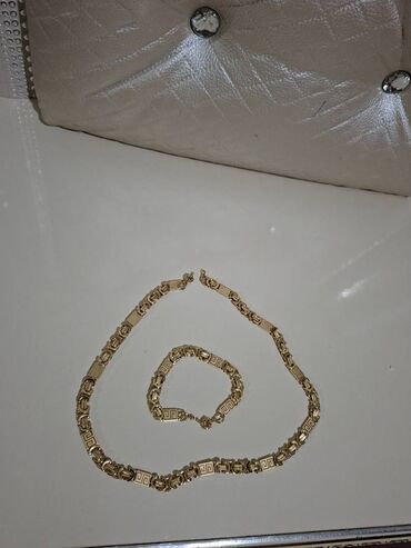 Qızılı rəngli zəncir kolye və bilərzik dəsti. Hər iki aksesuarda ön