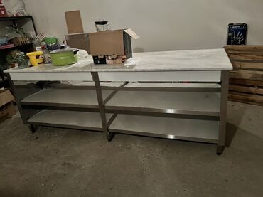 Mətbəx və ya anbar sahələri üçün uyğun olan bu çoxfunksiyalı iş masası mərmər naxışlı ağ səthə və möhkəm boz rəngli metal konstruksiyaya malikdir. Masanın altında əlavə saxlama üçün iki geniş rəf var. Bu, böyük iş səthinə ehtiyac duyan məkanlar üçün ideal bir həlldir. Masanın altında yerləşən tənzimlənən ayaqlar sayəsində qeyri-bərabər səthlərdə belə sabitlik təmin edilir.