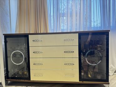 Şüşə vitrinli bufet/komod - Dizayn: Mərkəzdə 4 geniş çekmece, iki yanda şüşə vitrin qapıları. Qapılarda dekorativ dairəvi elementlər və qara çərçivə, çekmecələrdə metal halqalı tutacaqlar. - Üst h...