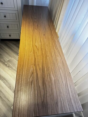 Mebel: Geniş bufet/konsol güzgü ilə - Dizayn: İki rəngli kombinasiya – krem və ağac teksturası. Üst hissə parlaq səthlidir, yüngül əyri güzgü ilə tamamlanır. - Ölçü (təxmini): uzunluq təxminən 2,0...