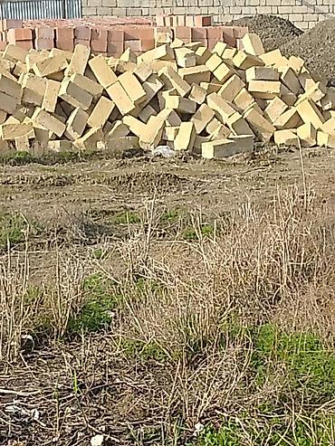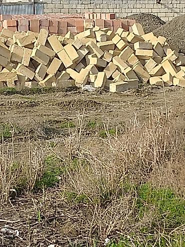 - Məhsul: Sarımtıl rəngli qumdaşı tipli tikinti blokları və arxada qırmızı kərpiclər