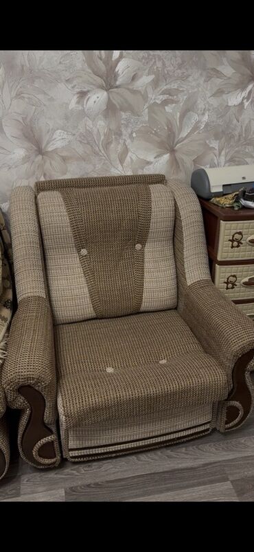 - Rəng və dizayn: bej-qəhvəyi tonlarda toxuma parça, ön və yan hissələrdə dekorativ düymələr və qıvrım taxta elementlər.