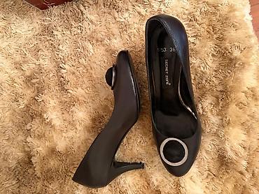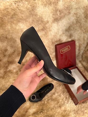 Zərif ofis və gündəlik klassik geyimlərlə uyğun gələn, rahat hündür dabanlı qara tufli. Minimalist görünüşü ön hissədəki dairəvi metal detal ilə vurğulanır. 38 ölçü aydın şəkildə işarələnib. Orijinal qutusu mövcuddur. Qiymet razılaşma yolu ile endirim ederik