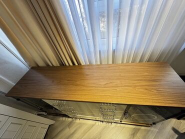 Mebel: Geniş bufet/konsol güzgü ilə - Dizayn: İki rəngli kombinasiya – krem və ağac teksturası. Üst hissə parlaq səthlidir, yüngül əyri güzgü ilə tamamlanır. - Ölçü (təxmini): uzunluq təxminən 2,0...