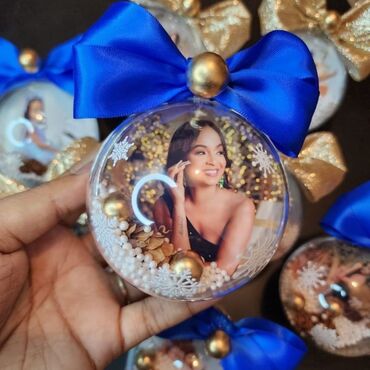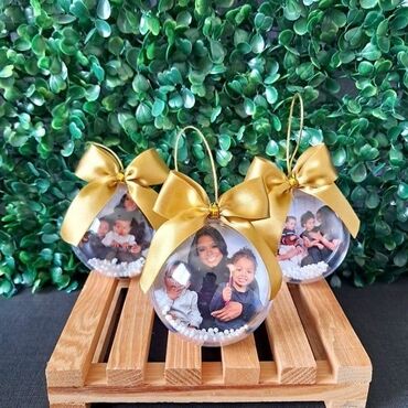 - Şəffaf plastik şar bəzəklər: Hər şarın içində sizin seçdiyiniz foto yerləşdirilir. İç hissə dekorativ qar dənələri, kiçik muncuqlar və qış motivli elementlərlə tamamlanır. Üst hissədə parlaq atlas lentdən böyük qızılı və ya mavi kəpənək düyünlü bəzək və asma ipi var. Ağac, qapı, pəncərə və ya istənilən bayram kompozisiyasında asmaq üçün uyğundur.