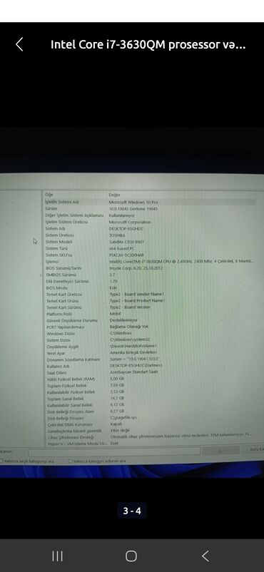 Toshiba Satalite L745 Ram : 8gb Prosessor : İntel(R) Core(TM) i3-2310M CPU : 2.10 GHz Saxlama Alanı : 112 GB Laptop üstündə Windows 7 ilə gəlmişdi,Windows 10 Pro və Ofis proqramları (Word,Powerpo...