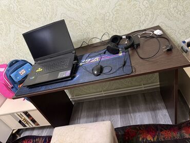 Kompüter/iş masası - Material: laminat/MDF səth, iki rəng kombinasiyası – albalı tonlu üst səth və rəfə uyğun hissələr, qara yan panellər - Ölçü təxmini: eni ~80–90 sm, dərinlik ~50–55 sm, hündürl...
