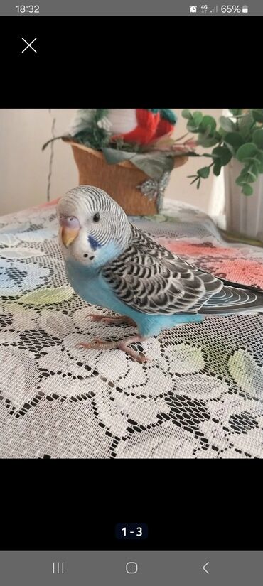 Məhsul: Dalğalı tutuquşu (budağı/əlin üstündə durmağa öyrəşmiş) Təsvir: - Rəng: açıq mavi-mavi gövdə, ağ baş, qara-bənövşəyi ləkəli naxışlar və qanadlarda zolaqlar - Növ: evdə saxlanan dalğalı tut...