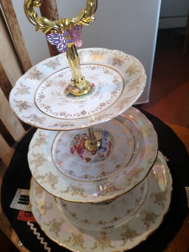 Üçmərtəbəli servis qabı – şirniyyat, meyvə və qəlyanaltılar üçün - Dizayn: Mozaika effektli naxışlar və qızılı ornamentlər; mərkəzdən keçən qızılı metal dirək və yuxarıda daşıma üçün dekorativ tut...