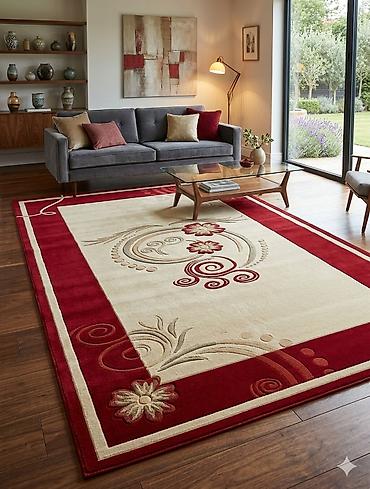 Xalça – klassik dizayn ,2×3ölçüde - Rəng: dərin bordo fon, bej haşiyə və yaşıl-mavi çalarlarında güllü naxışlar - Üslub: klassik/ornamental; mərkəzdə dairəvi medalyon, kənarlarda bitki motivli bor...