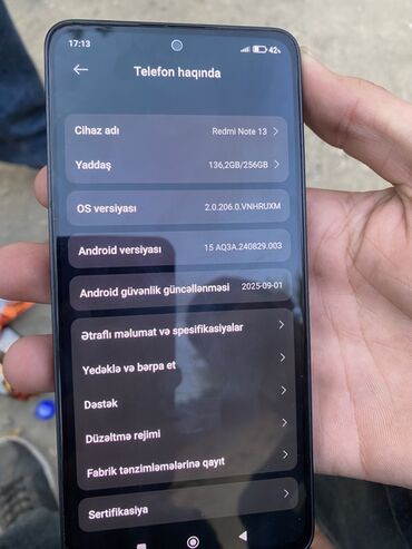 - Model: Redmi Note 13 (ekranda “Telefon haqqında” bölməsində göstərilir)