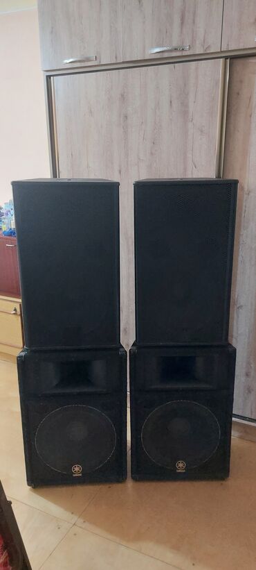 - 2 ədəd Yamaha passiv akustik sistem: yuxarıda tam diapazonlu kabinetlər, aşağıda isə bas kabinetləri (subwoofer) ilə cüt şəklində. Ön hissə metal qəfəsli, aşağıda Yamaha loqosu görünür. Orta və yüksək tezlik üçün horn, dərin bas üçün böyük diametrli wooferlər.