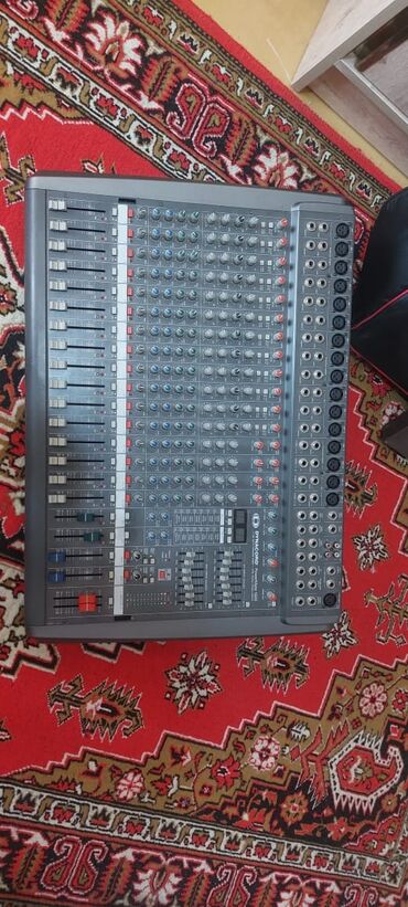 - Mikser bölməsi: çoxkanallı konsol; hər kanalda gain, EQ (HF/MF/LF), aux və effekt düymələri, solo/mute, faderlər; master hissədə qrafik ekvalaizer, daxili effektlər bölməsi, səviyyə indikatorları. Girişlərdə XLR və 6.3 mm TRS kombinə portlar var.