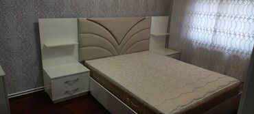 2) Çarpayı – yumşaq başlıq (krem rəngində kapitone effektli panellər), iki tərəfdə inteqrə olunmuş tumbalar: hər tumbada 2 çekmece və əlavə açıq polka.