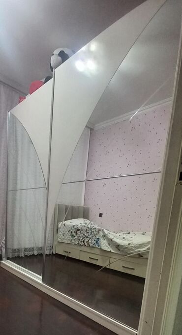 3) Kupe şkaf – sürüşkən qapılar, tam boy güzgülü ön panel, dekorativ şüşə/ayna aplikasiyaları. Geniş saxlama həcmi.