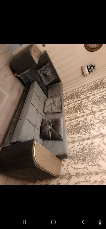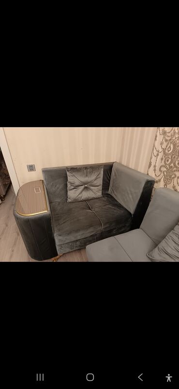 Künc divan və sehpə dəsti - Model: L‑şəkilli künc divan, 3+1 oturacaq zonası - Rəng: Tünd boz (yastıq və qol hissələrində dekorativ lent vurğuları) - Material: Yumşaq məxməri/parça üzlük, taxta ka...