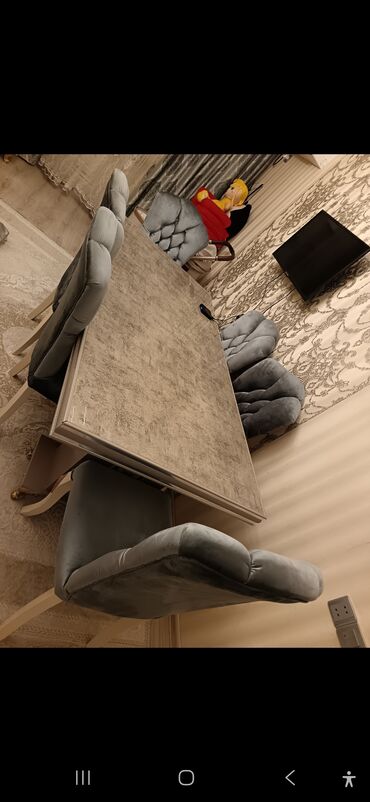 Divan Original fabrik istehsalı mebel dəsti. • Yemək masası və stul dəsti: - Uzun, parlaq səthli dikdörtqan masa - Kənarları klassik naxışlı, qızılı dekor elementləri - Rəngi açıq krem-bej t...