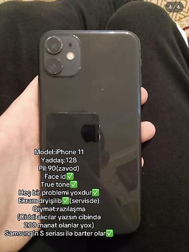 IPhone 11 (qara rəng) - 128GB yaddaş (şəkillərə əsasən iPhone 11, qara korpus) - Ekranda Face ID çentiyi, Face ID işlək - True Tone funksiyası aktivdir - İkiqat arxa kamera modulu, LED flaş - Bata...