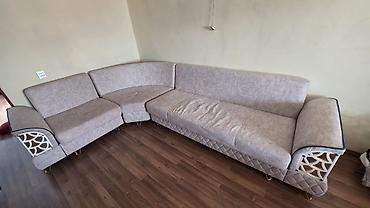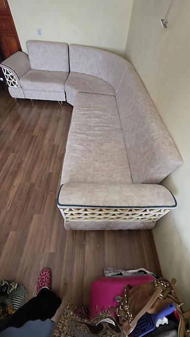 az işlənmiş L oturacaq. Künc divan – açıq bej rəngli, yumşaq toxumalı parça üzlük.