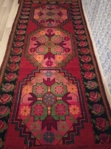 salam. Qazax xalçasıdır, təbii əl ilə toxumadır. Antik xalçadır. 28 yaşı var. - Tip: dekorativ döşəmə xalçası - Ölçü: təxminən 2,5 x 1,3 m (şəkilə əsasən) - Dizayn: mərkəzdə romb/mihrabvari medaly...